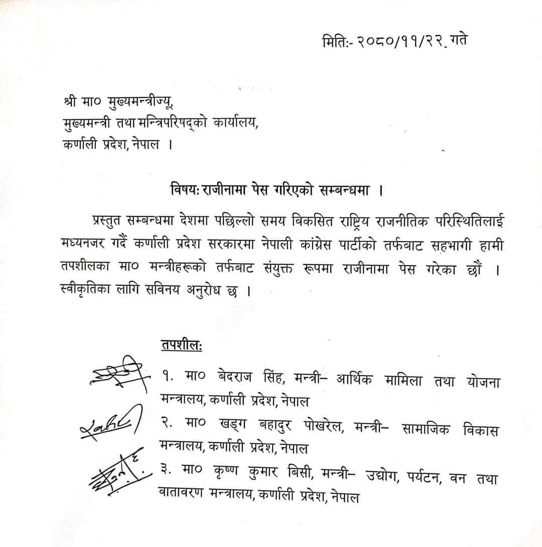 प्रदेश सरकारमा आर्थिक मामिला योजनामन्त्री बेदराज सिंह, सामाजिक विकासमन्त्री खड्गबहादुर पोखरेल र उद्योग पर्यटन तथा वातावरणमन्त्री कृष्णकुमार बिसीले राजीनामा दिएका छन् ।