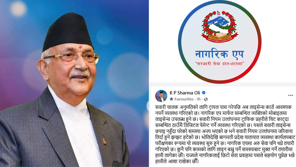 प्रधानमन्त्री केपी शर्मा ओलीले नागरिक एपमार्फत सम्बन्धित व्यक्तिको मोबाइलमा लाइसेन्स उपलब्ध हुने जानकारी गराए।