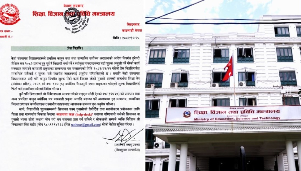 काठमाडौं । शिक्षा, विज्ञान तथा प्रविधि मन्त्रालयले गैरकानुनी रुपमा सङ्कलन गरिएको शुल्क विद्यार्थीलाई फिर्ता गर्न निर्देशन दिएको छ ।